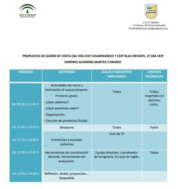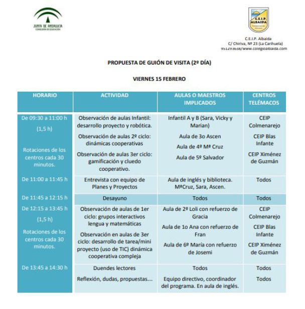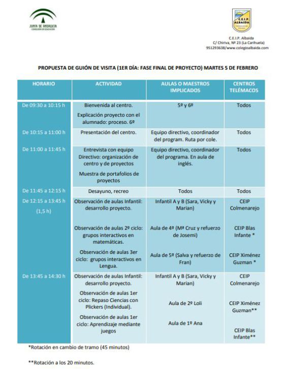 Tras la formación con el Centro del Profesorado de Málaga, los cuatro centros acordamos la temporalización de las visitas y el centro mentor organiza el siguiente programa de observación:
