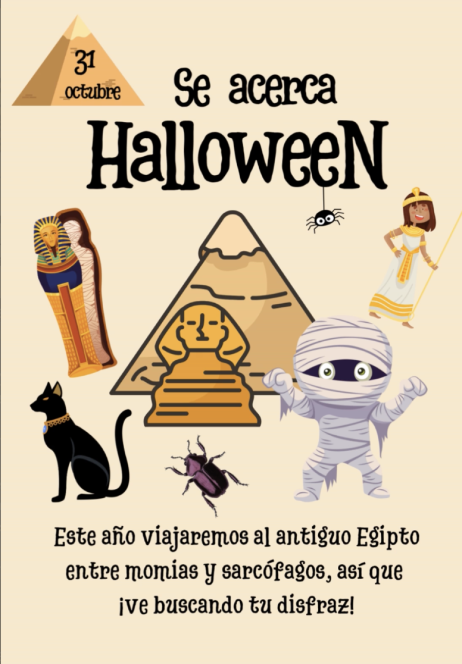 El viernes 31 de octubre celebraremos Halloween en el colegio de una manera muy especial, con una fiesta tematizada en el Antiguo Egipto. Para que el alumnado se sumerja en un pasado místico y ancestral, nuestro alumnado se convertirán en faraones, reinas, tumbas, momias, dioses egipcios (como Anubis o Ra), telarañas, gatos negros, escarabajos o incluso arqueólogos y exploradores...